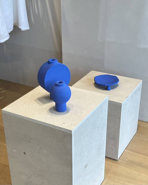 An alchemic colour like cobalt feels completely at home sitting within Britt’s Clae Studio collection, but bright hues are a more recent addition. “I usually work with neutrals so such a vibrant colour is quite the departure for me,” says Britt. “This particular shade of blue just jumped out at me and once I tested it on my pieces I fell in love! It was time for me to try something new and introducing a bold colour felt like a fun way to do that.” And there’s nothing surface-level about Britt’s use of colour. Before adding the cobalt to the ceramic, Britt creates a subtle texture “that brings all the sand and grit in the clay to the surface”. This texture, she says, “adds an element of depth and visual interest allowing the ‘Klein’ blue to really come to life”.