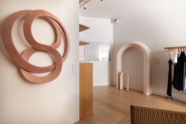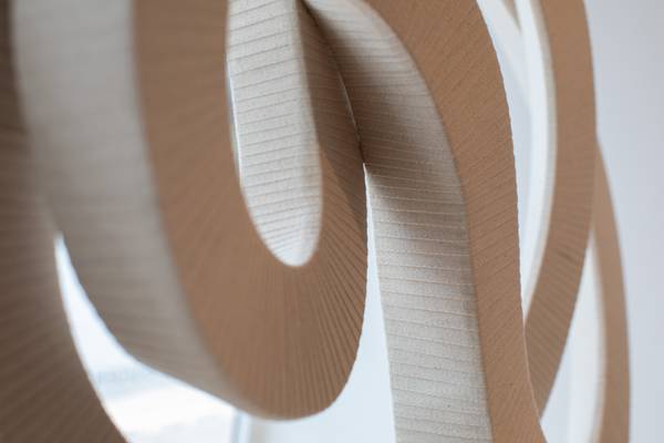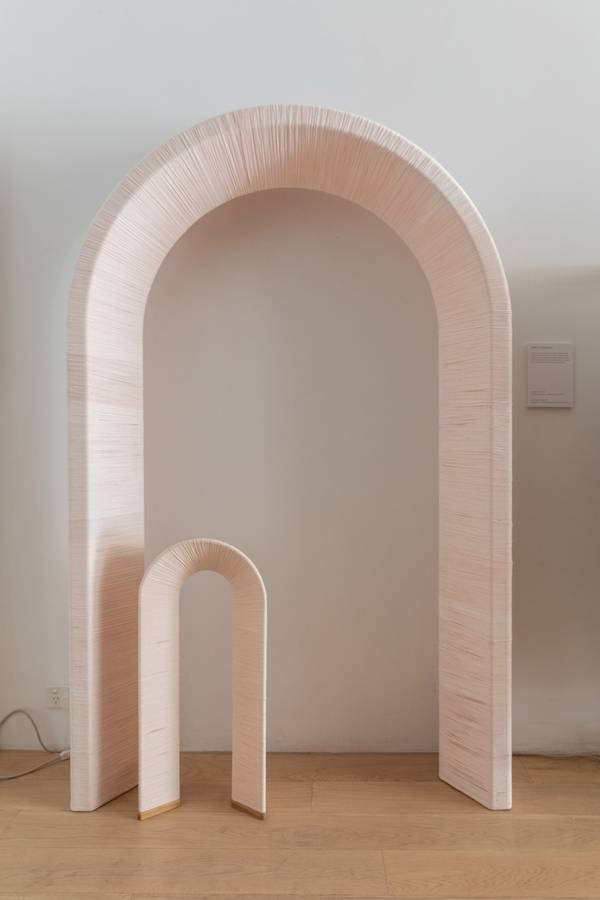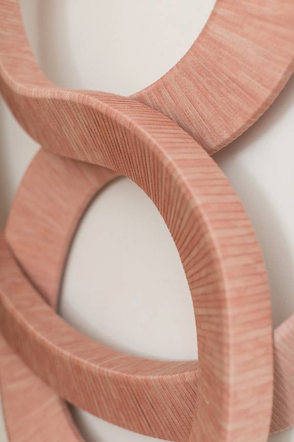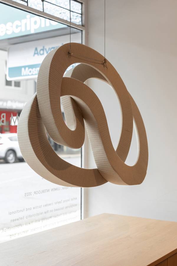 The duality of Ivana’s practice, the sensuality and structure, is embodied by her Interloop sculptures, which can be suspended solo or play in groups of twos and threes. These works materialised during the Covid pandemic, when Ivana returned to basic textile skills to satisfy her “need to make”. When she could finally return to her timber workshop, a few “happy accidents” resulted in loop structures that led to the wrapped Interloop sculptures she is known for today. Is there something human in the sculpture’s hard skeleton interior and fleshy outer layer? “Absolutely,” says Ivana, who welcomes the ways in which people interpret her artworks. “I love how people read dancing figures or the mother and child motif within them. I often start with a gesture or movement I’ve felt or observed — something like a hug, kiss or spin — and the loops emerge from that.”