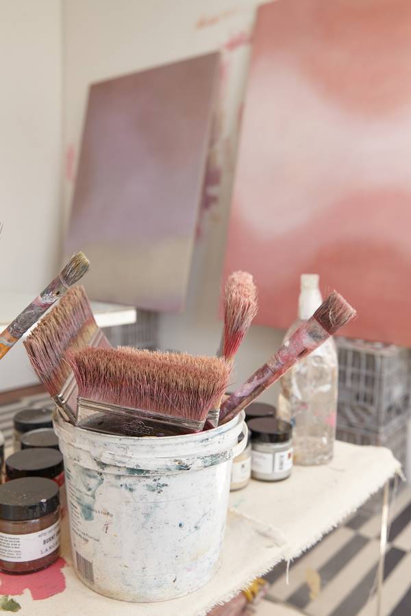 My studio has windows that look to the West through the trees. The room is light and calm, usually pretty organised as I don’t like chaos. One of the walls is lined with books collected throughout the years. Sometimes I like to reference while I’m working, like company from people I greatly admire; “The Natural World by Cy Twombly”, “The Magic of Trees” by Hatje and “Colour” A series of lectures by Rudolf Steiner, are a few. A large table covered in glass for mixing mediums lies in the centre of the room, dividing the space, then a wall where I paint. I usually leave strokes of paint from the brush that also provide me with a visual reference to what I’ve created. I work on stretched linen, and there are always a few canvases against the wall, with a lucite trolley where my pigments live.