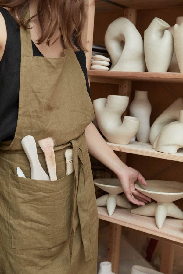 My style is minimal and relaxed. My clothes are constantly covered in clay dust at the studio, so an apron is my go-to studio work uniform. I often wear workwear pants, denim, oversized shirting and linen. Working such long days, I prioritise being comfortable.