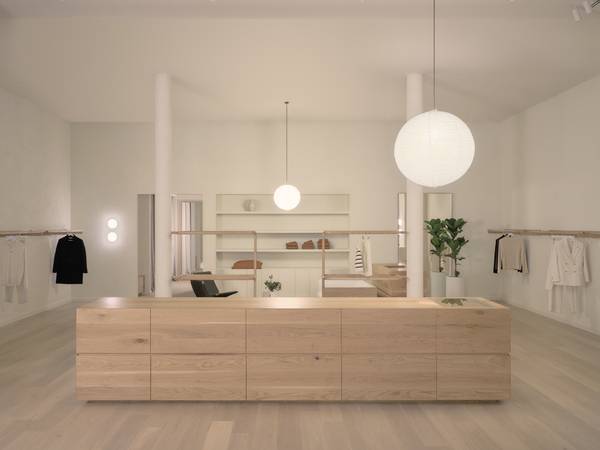 Tasked with translating Assembly Label’s design language for this new location, the team at IF Architecture “leaned into the principles of minimalist design” and established visual harmony through thoughtfully layered textures, hard and soft materials, and warm and cool neutral tones. Natural oak floorboards with a soft cloud-like finish, travertine tiles at the entrance and warm off-white walls with a fine grain set the foundation for the entire space. Assembly Label’s connection with coastal environments is expressed through more layers of natural materials in the changing rooms, including woven linen blend curtains that create an elegantly draped effect and a sisal floor covering in a chevron pattern that introduces the feeling of natural texture underfoot. These elements encourage relaxation and create a seamless transition throughout, inviting visitors to explore new season collections and design offerings at their own pace.