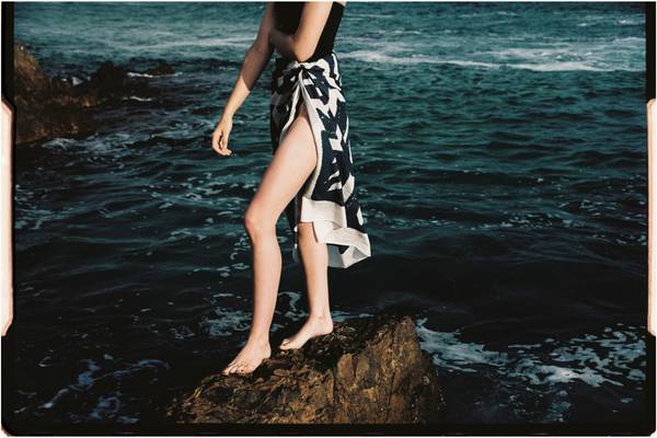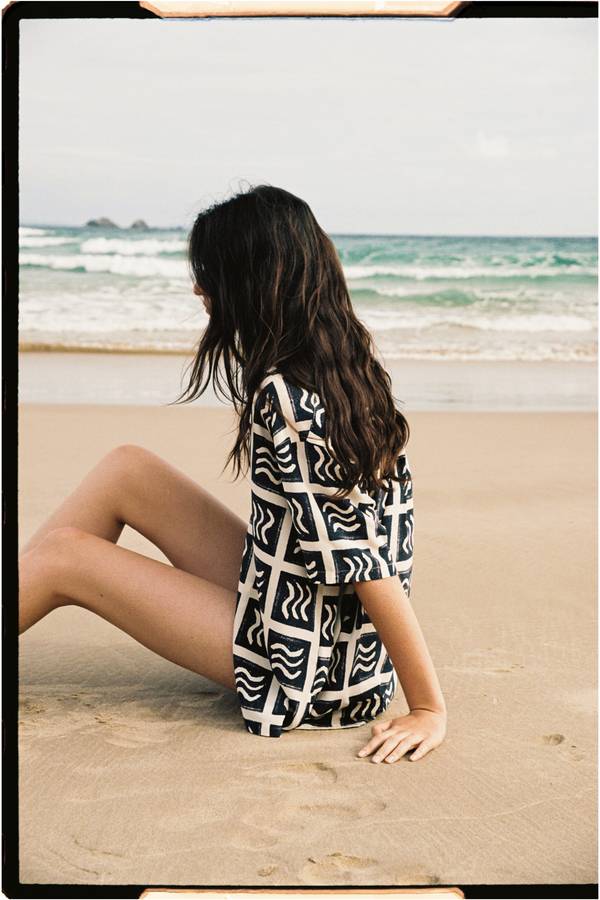 The wave print is available in a pure silk short sleeve shirt, and a sarong made from lightweight cotton voile.