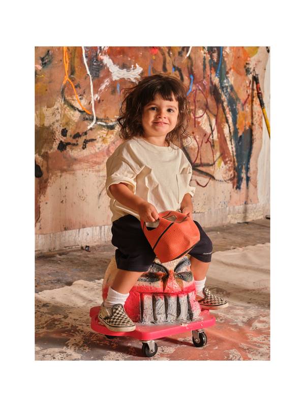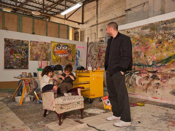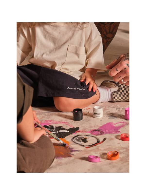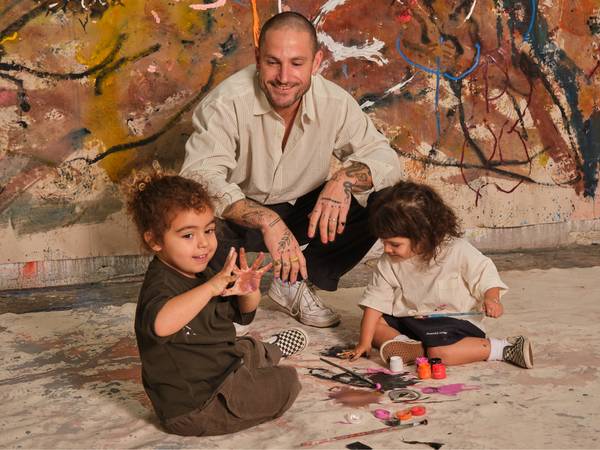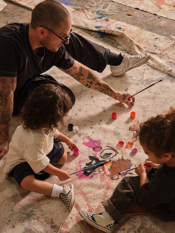 Now based in the Northern Rivers, Saxon is best known for his colourful, abstract works featuring childlike motifs, some of which are directly inspired by his children’s own scribbles. As a long-time friend of the brand, we caught up with Saxon in the lead up to Father’s Day to find out how he’ll be celebrating with his kids, the influence of his creative parents, and the family rituals he holds most dear.